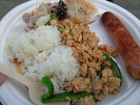 เป็นเซทขายถูกสามอย่าง1000เยน เลือกได้จากหลายอย่าง ผมเลือกกะเพราะไก่ราดข้าวกับยำวุ้นเส้น แล้วก็ไส้กรอกอีสาน