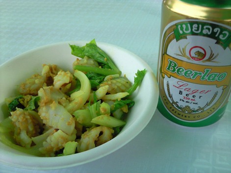 เบียร์ลาวกับปลาหมึกผัดผงกะหรี่
