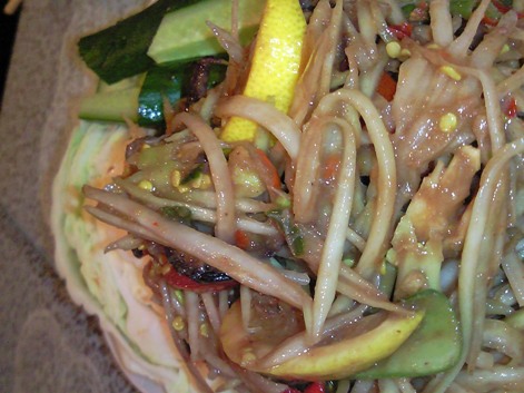 さてソムタムが出てきましたが、食べてみると少し堅過ぎる感じ。きっと潰しが足りないのでしょうね。なのでやさしめに「パパイヤが堅すぎない?来てみ?食べれば分るから」と言ったのですが、